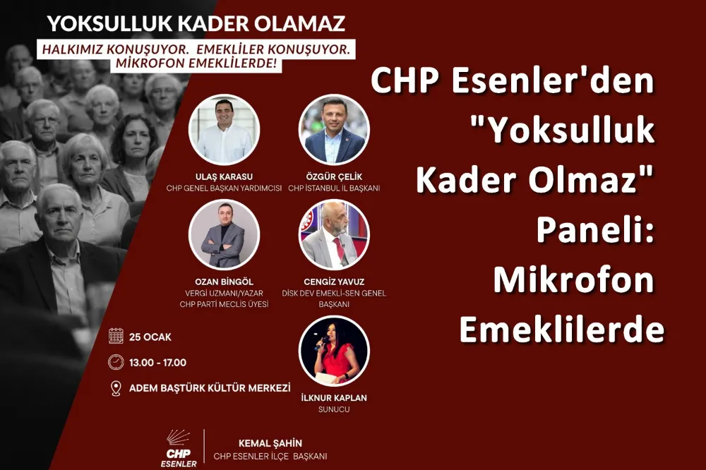 Cumhuriyet Halk Partisi  Esenler İlçe Başkanlığı, "Yoksulluk Kader Olmaz, Halkımız Konuşuyor, Emekliler Konuşuyor" ana teması ve "Mikrofon Emeklilerde" başlığı altında bir panel düzenleyeceğini duyurdu.