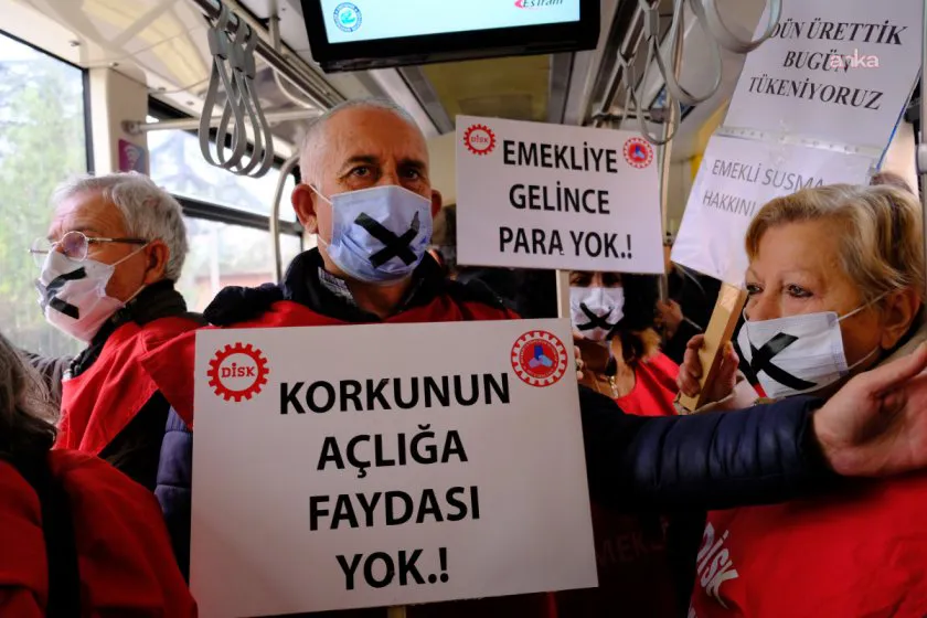 DİSK Emekli Sen üyeleri, emekli aylıklarının düşüklüğüne dikkati çekmek amacıyla tramvaylarda ağızlarına yapıştırdıkları bantlarla sessiz eylem yaptı.