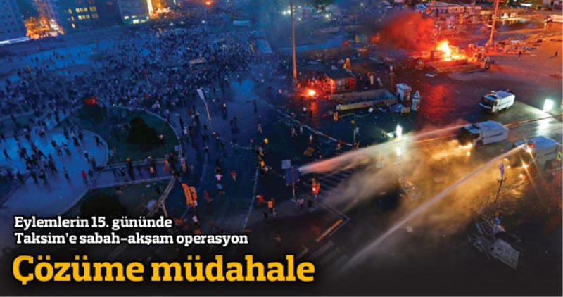 Operasyon sabah polisin göstericilere yönelik “Lütfen dikkat! Gezi Parký ve içindekilere kesinlikle dokunulmayacaktýr” anonslarý arasinda basladi. Bazi küçük gruplar polise tas ve molotofkokteyli atarken Çevik Kuvvet de tazyikli su ve biber gaziyla karsilik verdi. Atatürk Aniti ile Atatürk Kültür Merkezi’ni kaplayan pankartlar ve dövizler ögle saatlerinde polis tarafindan kaldirildi. Taksim Meydani’na çikan çesitli noktalarda polisle göstericiler arasinda çatismalar sürerken çok sayida TOMA, ambulans, takviye su tankerleri ve Akrep tipi polis araci da meydanda konuslandi.
