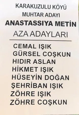 15 hanenin ve 30 seçmenin bulunduğu köyde kullanılan 22 oydan 11'ini Anastassiya Metin, 3'ünü eski muhtarın eşi Gülhan Korkmaz, 7'sini ise diğer aday Bayram Korkmaz alırken, bir oy da geçersiz sayıldı. Anastassiya Metin, "Köyüme hizmet etmek için aday oldum. Köyümüzün asfalt ve elektrik sorunları var. Önceliğim bunlar olacak. Köyümüzün ilk kadın muhtarı olduğum için mutluyum" diye konuştu. Kaynak; Sabah Gazetesi