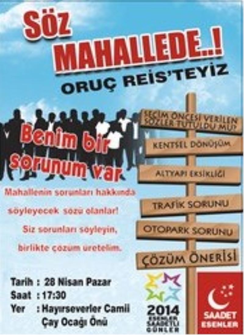 Daha önce Turgutreis ve Çiftehavuzlar mahallesinde gerçeklestiren Saadet Partisi Esenler ilçe teskilati bu seferde “ söz mahallede “ programi Oruçreis Mahallesinde gerçeklesti.