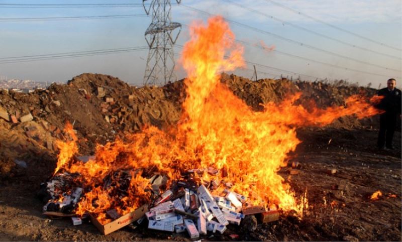 Esenler Ilçe Emniyet Müdürlügü ekiplerince yakalanan kaçak 8 bin paket kaçak sigara bos arazide böyle yakildi.