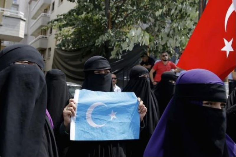 Dün, Çin Konsoloslugu önünde "Uygur Türkleri`ne zulüm" dezenformasyonuna uygun eylem gerçeklestiren grup üyeleri arasinda burka ve çarsaf takanlar görüldü.