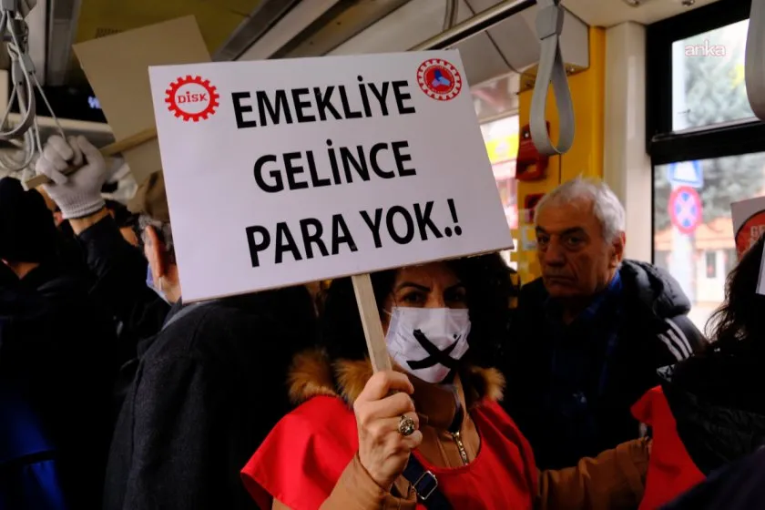 DİSK Emekli Sen üyeleri, emekli aylıklarının düşüklüğüne dikkati çekmek amacıyla tramvaylarda ağızlarına yapıştırdıkları bantlarla sessiz eylem yaptı.