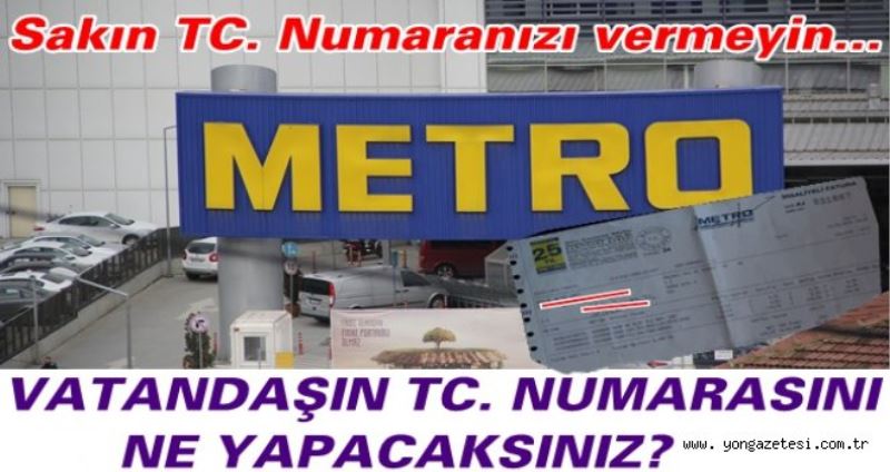 Metro Marketten alis-veris yapan vatandaslardan TC. kimlik numarasi alinmadan mal satisi yapilmiyor. Akilli ve uyanik olan bazi vatandaslar TC. Numarasini vermeyerek aldiklari mallari iade ediyor.. Bu konuda gazetemize yapilan sikayetlere istinaden vergi dairesi olumlu yanit vermekten kaçiniyor.. Metro marketin yabanci ortakli olmasi TC. numarasi almasi müsterilerin kafasinda soru isareti birakiyor. TC. numarasi skandalina dur diyecek yetkili bir makam yok mu?